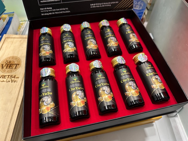 - Thành phần: Chiết xuất Hàu biển (50%), Chiết xuất Đông trùng hạ thảo (30%), Chiết xuất Sâm dây Ngọc Linh (10%), Chiết xuất Cá ngựa (5%), Chiết xuất Yến sào (3%), Collagen (1.500mg), Vitamin C, Đường và Mật ong.