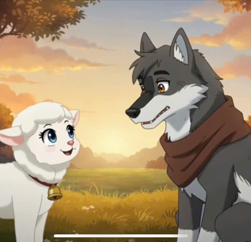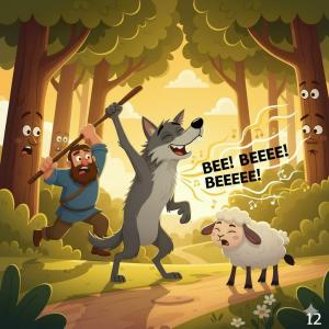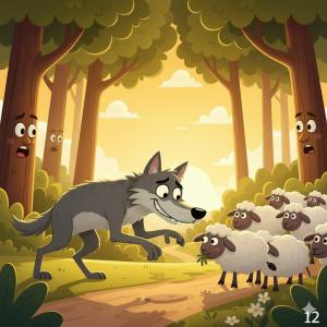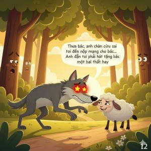 Cừu non bị Sói định ăn thịt nhưng nhờ nhanh trí, giả vờ hát để báo cho người chăn cừu đến cứu, nên thoát nạn.